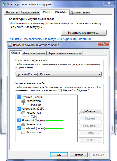В систему windows 7 установилась поддержка японского и корейского