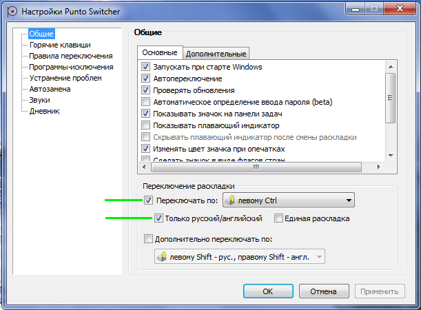 галочки в двух местах. Теперь вы будете переключать язык только между RU